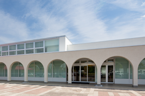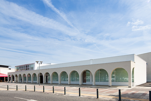 ローマのコロツセオのようなアーチ状の庇と透明感ある⼀⾯ガラス張りのファザード。