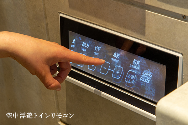 VIP TOILETの大きな特徴である、触らずにトイレを操作できる『空中浮遊トイレリモコン』も設置されています。