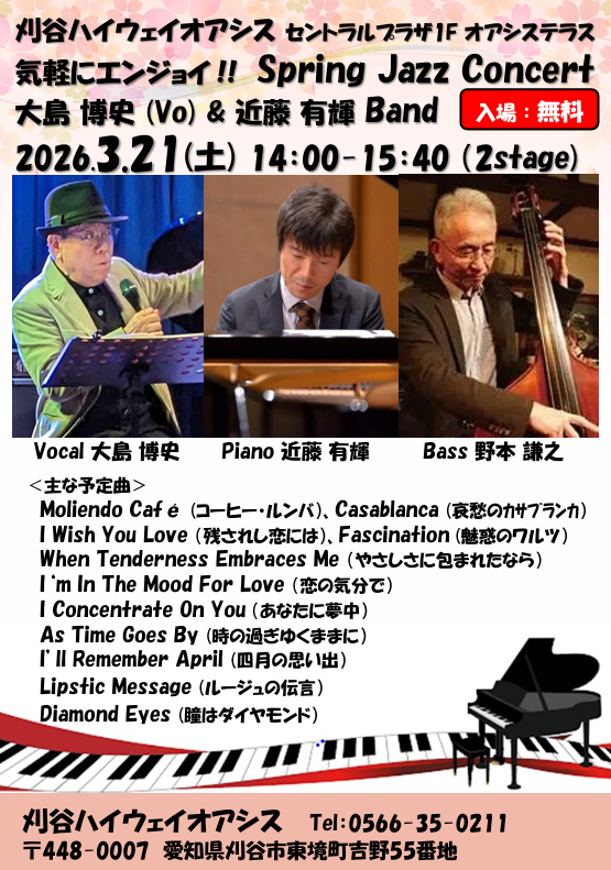 最新情報 News 最新情報 もっと見る Information施設紹介 Eventイベント 2026.03.21(土) 2026年3月21日(土) 「Spring Jazz Concert」 2026.01.26(月) 2026年2月のイベントカレンダーを更新しました!