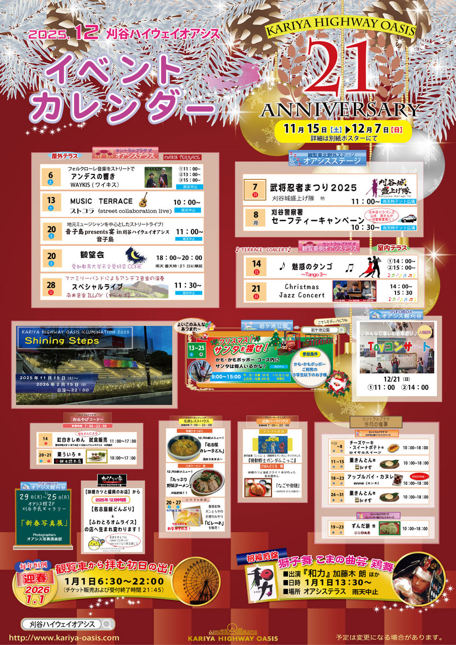 最新情報 News 最新情報 11月26日(水)セントラルプラザ1F「おみやげコーナー」おすすめの品更新しました! 11月15日(土)21周年祭特別企画!デジタルレシートラリーを開催します!! 11月15日(土)21年目の刈谷ハイウェイオアシスは楽しい・美味しいがいっぱい! Shopping&Gourmet Guide! もっと見る Information施設紹介 Eventイベント 2025.11.25(火) 2025年12月のイベントカレンダーを更新しました!