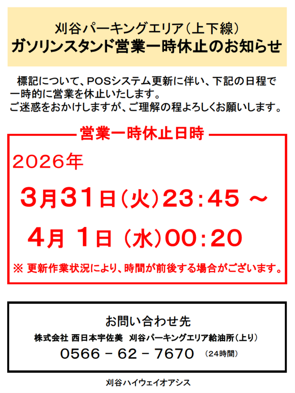 刈谷パーキングエリア(上下線)ガソリンスタンド営業一時休止のお知らせ